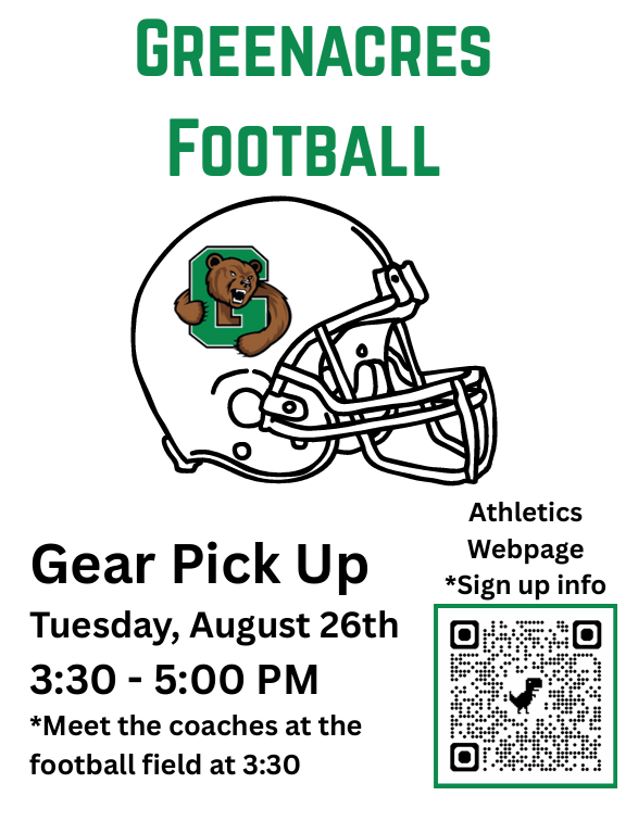 Football Gear Pick Up on Tuesday, August 26th, 3:30-5:00 pm.